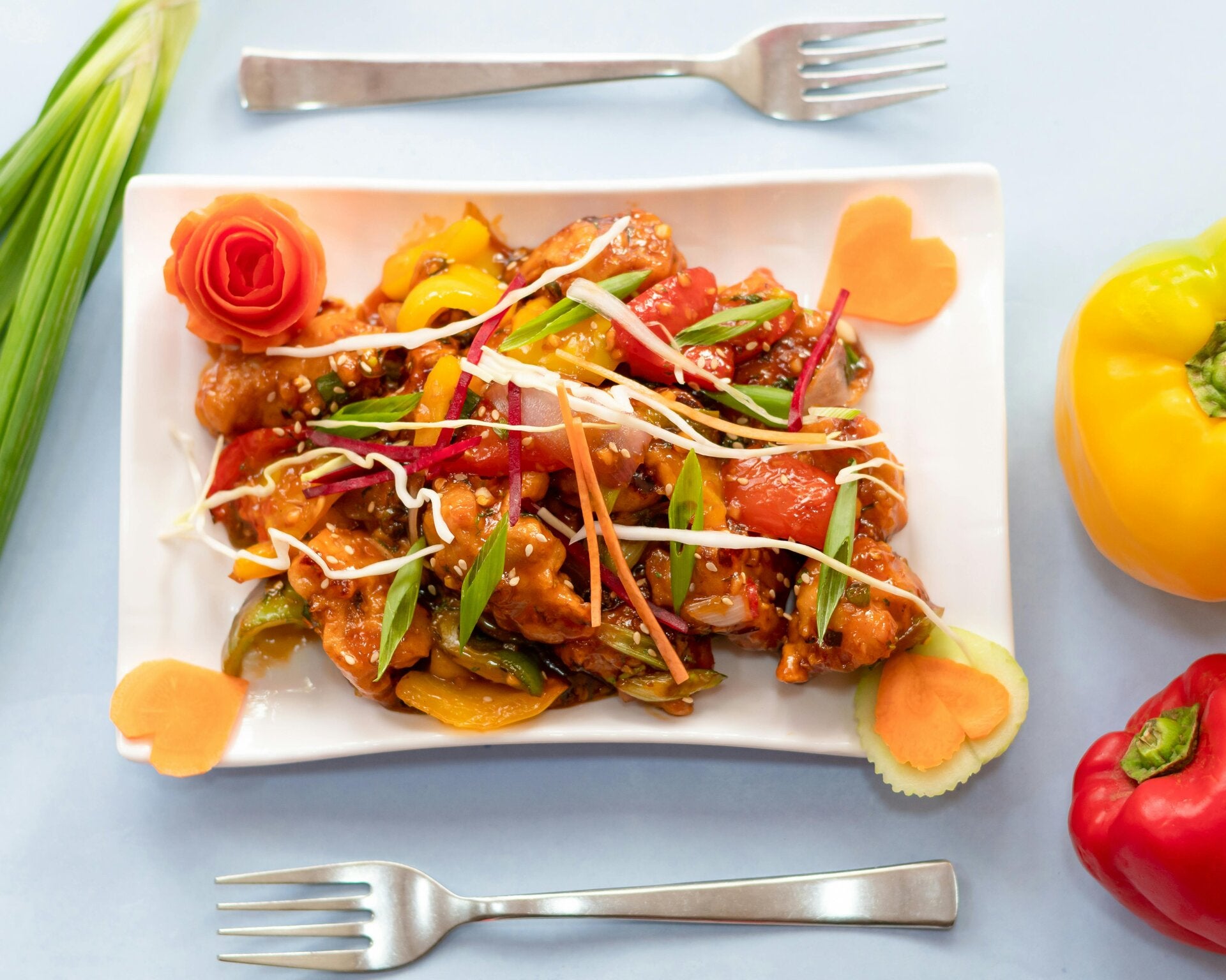 Crispy chicken pieces wok-tossed in a sweet and spicy sauce, served with steamed rice.